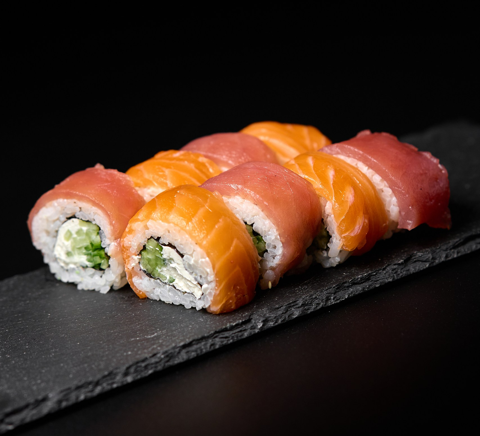 Połączenie świeżego łososia i świeżego tuńczyka z kremowym serkiem oraz chrupiącym ogórkiem tworzy wyrazistą, harmonijną kompozycję.