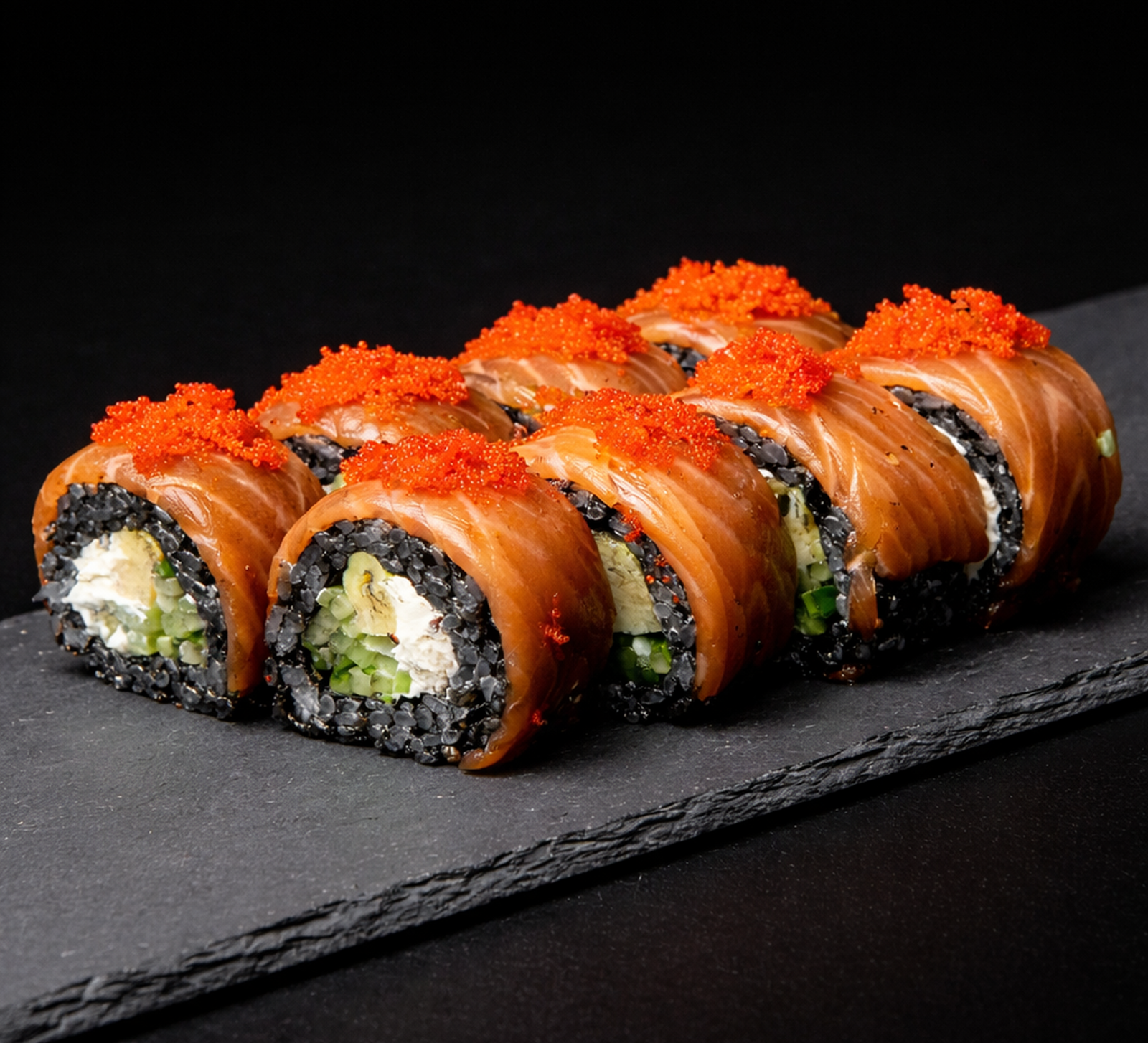 Kremowy serek, świeży ogórek i delikatne tamago w połączeniu z soczystym łososiem oraz dodatkiem tuszu kałamarnicy tworzą wyjątkową, autorską kompozycję. Tobiko nadaje całości wyrazistej tekstury i morskiego charakteru.