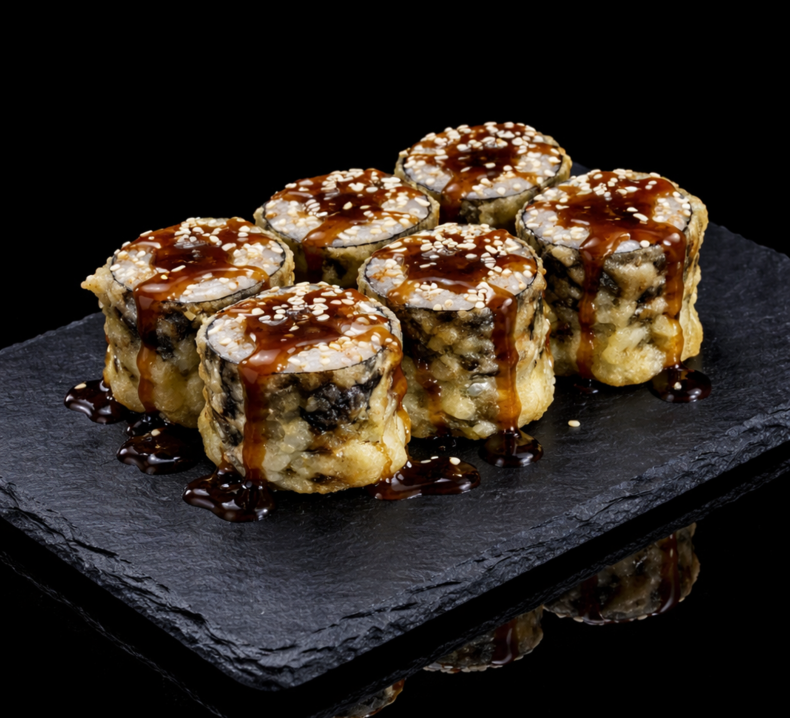 Hosomaki z kanpyo w tempurze polana sosem terijaki i posypana sezamem