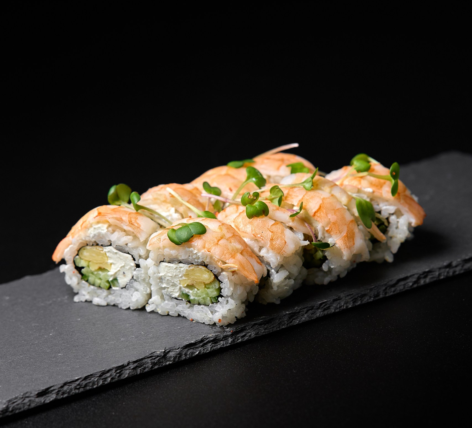 Delikatna, gotowana krewetka w połączeniu z kremowym serkiem, puszystym ryżem i nori tworzy łagodną bazę smaku. Ogórek, tamago oraz świeże kiełki dodają lekkości, świeżości i przyjemnej chrupkości.