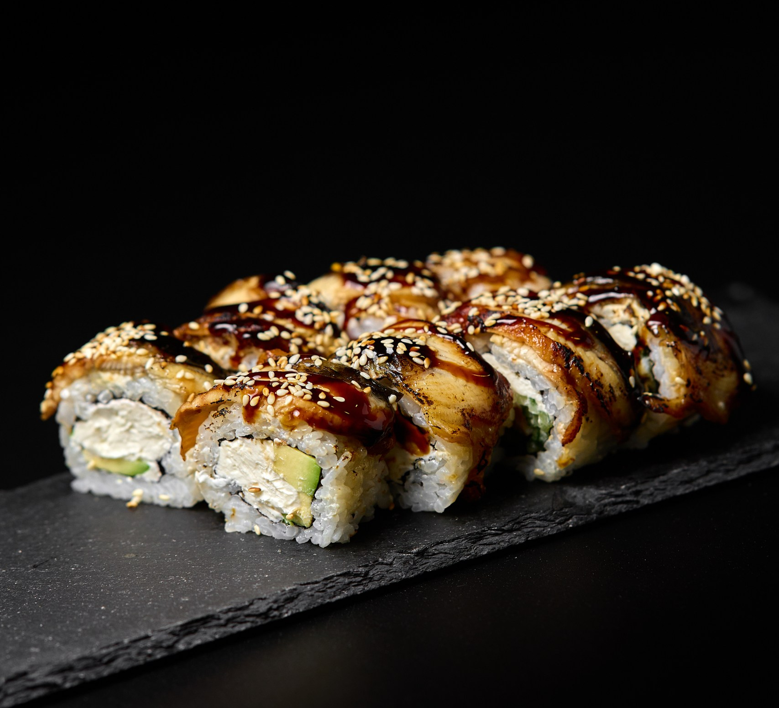 Delikatny węgorz i kremowy ser w połączeniu z aksamitnym awokado, puszystym ryżem i nori tworzą wyrafinowaną kompozycję smaków. Czarny sezam dodaje orzechowej nuty, a sos unagi podkreśla całość słodko-słonym aromatem.
