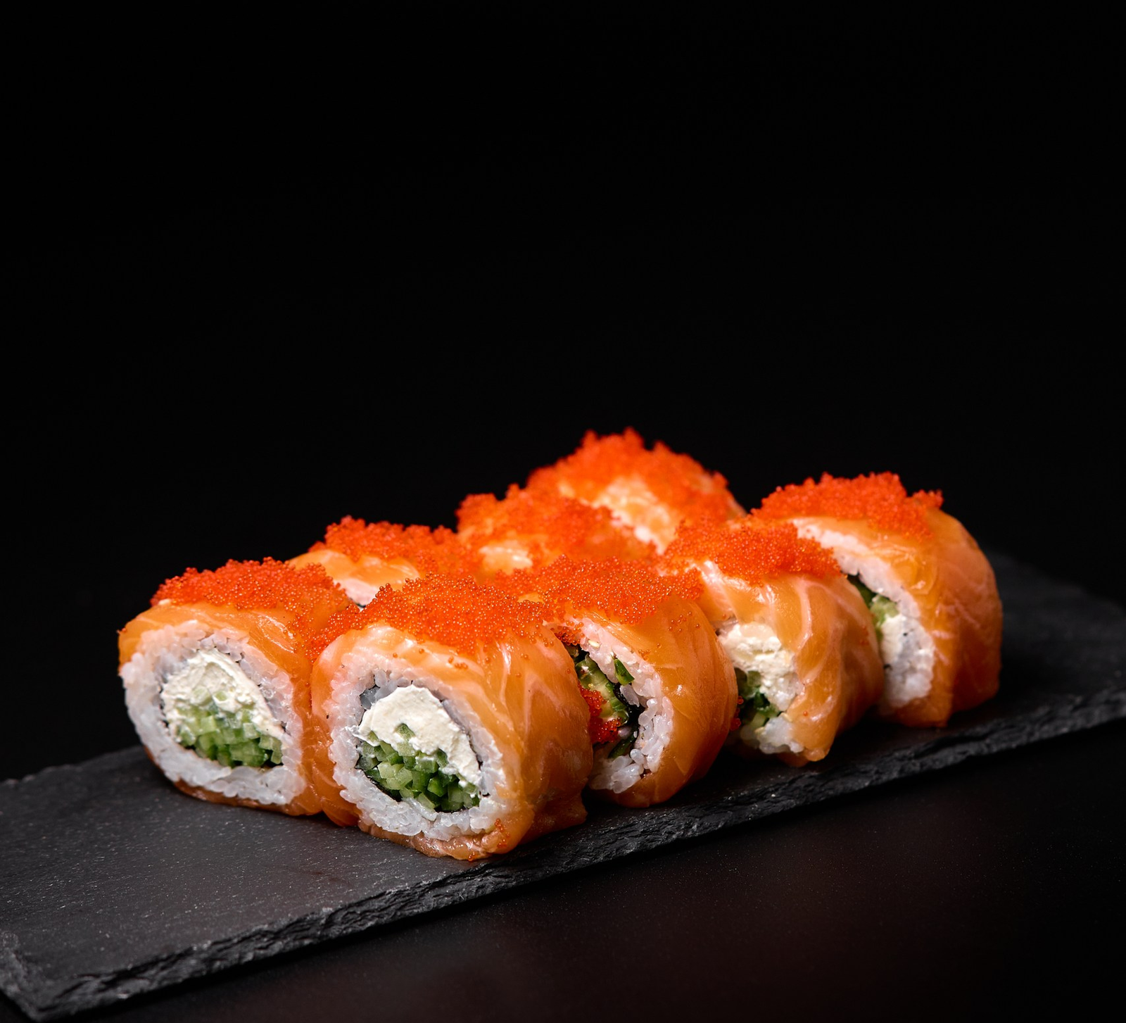 Kremowy serek śmietankowy i świeży ogórek otulone soczystym łososiem 360°. Całość posypana czarnym tobiko, które dodaje wyrazistej, morskiej nuty i eleganckiego wykończenia.